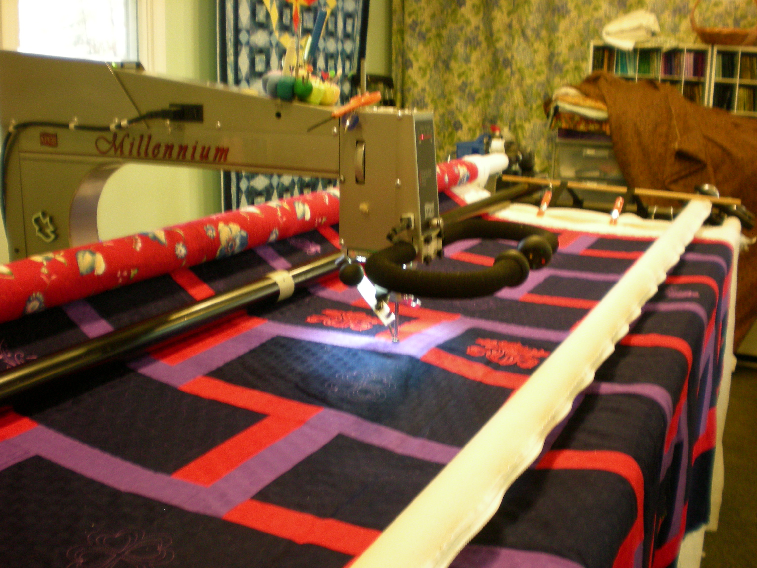 Here’s one more look at this fun machine.  This Millennium is on a 12 foot table.  While I can fit a 12 foot table in the room I’ve chosen for my ‘studio’–I say that loosely and with a smirk on my lips–I am leaning toward a 10 foot table, as I would still be able to work on queen size quilts easily, and possibly king size quilts if I quilted the borders separately, and yet it would fit more easily into the room, allowing ample space for the other parts of quiltmaking.Do I go for the larger table?  Would a less expensive but well built machine, like an APQS Lucey or a Nolting be a good choice?  Or is local service more important than the machine?  If so I might consider a Baby Lock Crown Jewel.   This machine needs to last me for 30 years so it is a big decision.