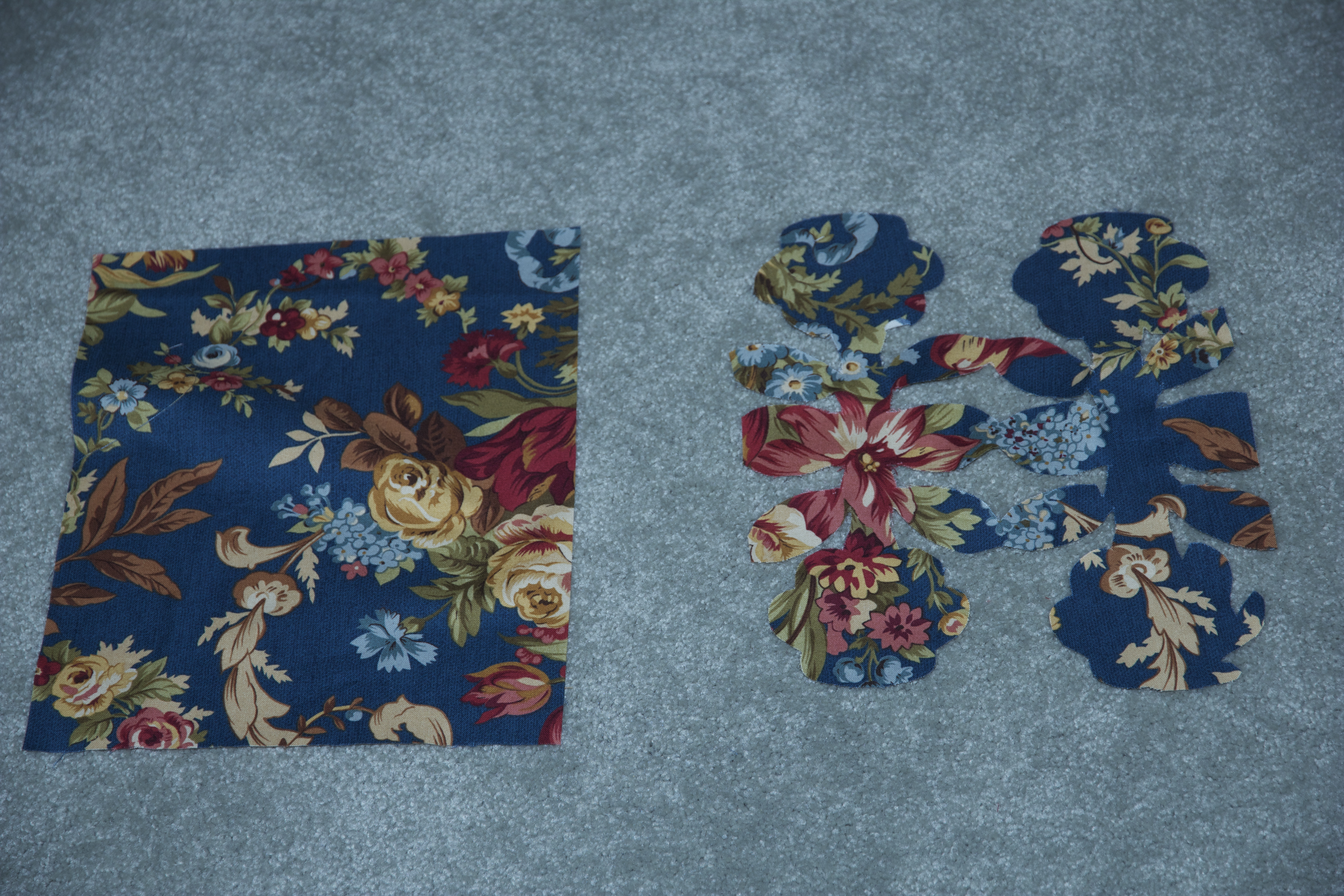 I moved on to the ugliest fabric that I have in my stash, and handled it in the same manner, as if it were a piece of paper.  I cut the same design. Image