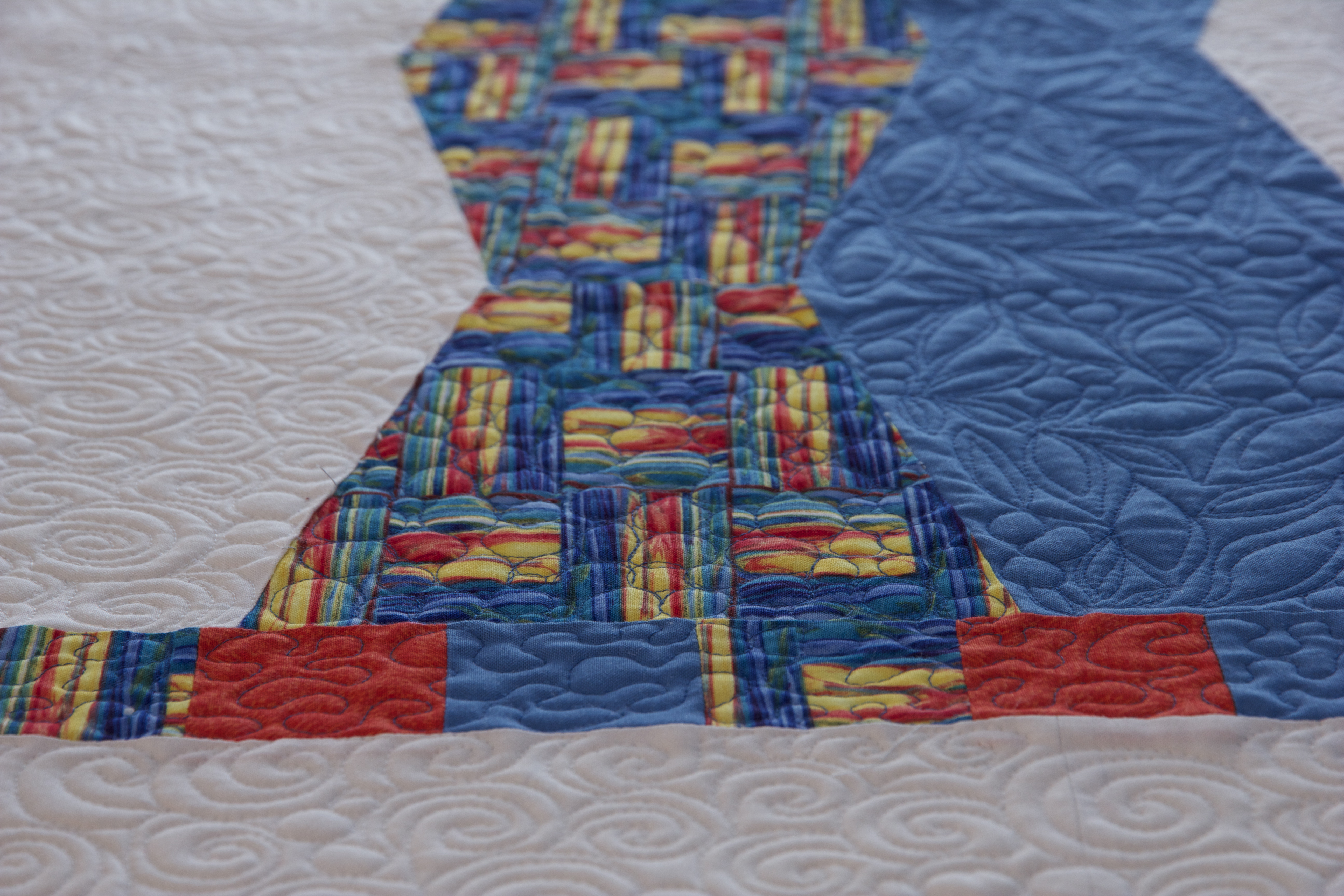 I became a little lazy on the pieced border and just meandered.  On the white border I again repeated the circles and swirls, which I had used on the white negative space in the body of the quilt top, because they are really fun to do, although so are the leaves and circles…so many options, so few quilt tops!IMG_0537circles on anglesAnd a few more close ups of the circles.  Do you find certain designs portray emotions, too?  And why do mistakes always happen where they show?  In this case, it seemed any mistitch (new word by the way or if you are not grammatically daring ‘missed stitch’) occurred when I was on the yellow with my blue thread!