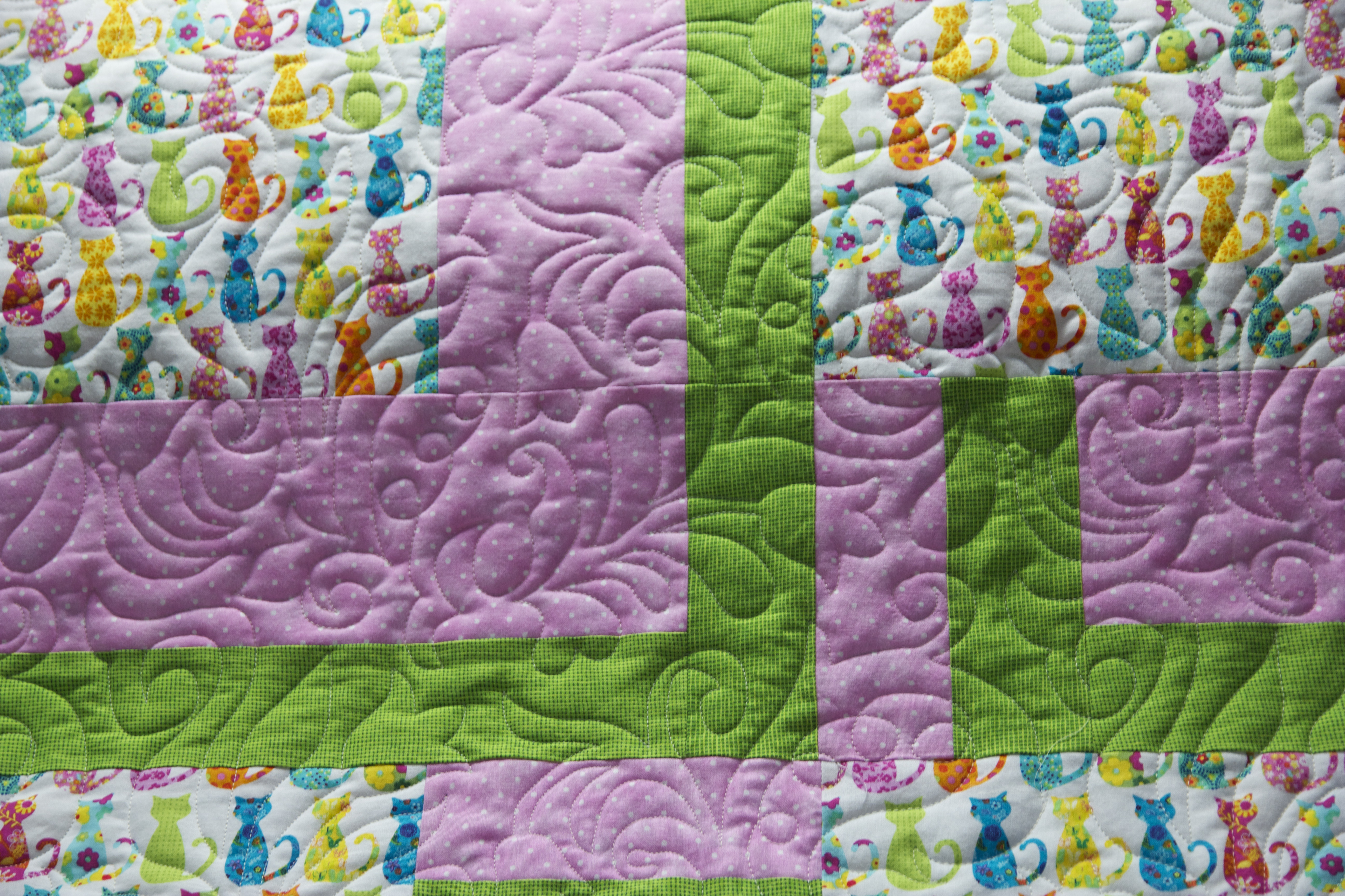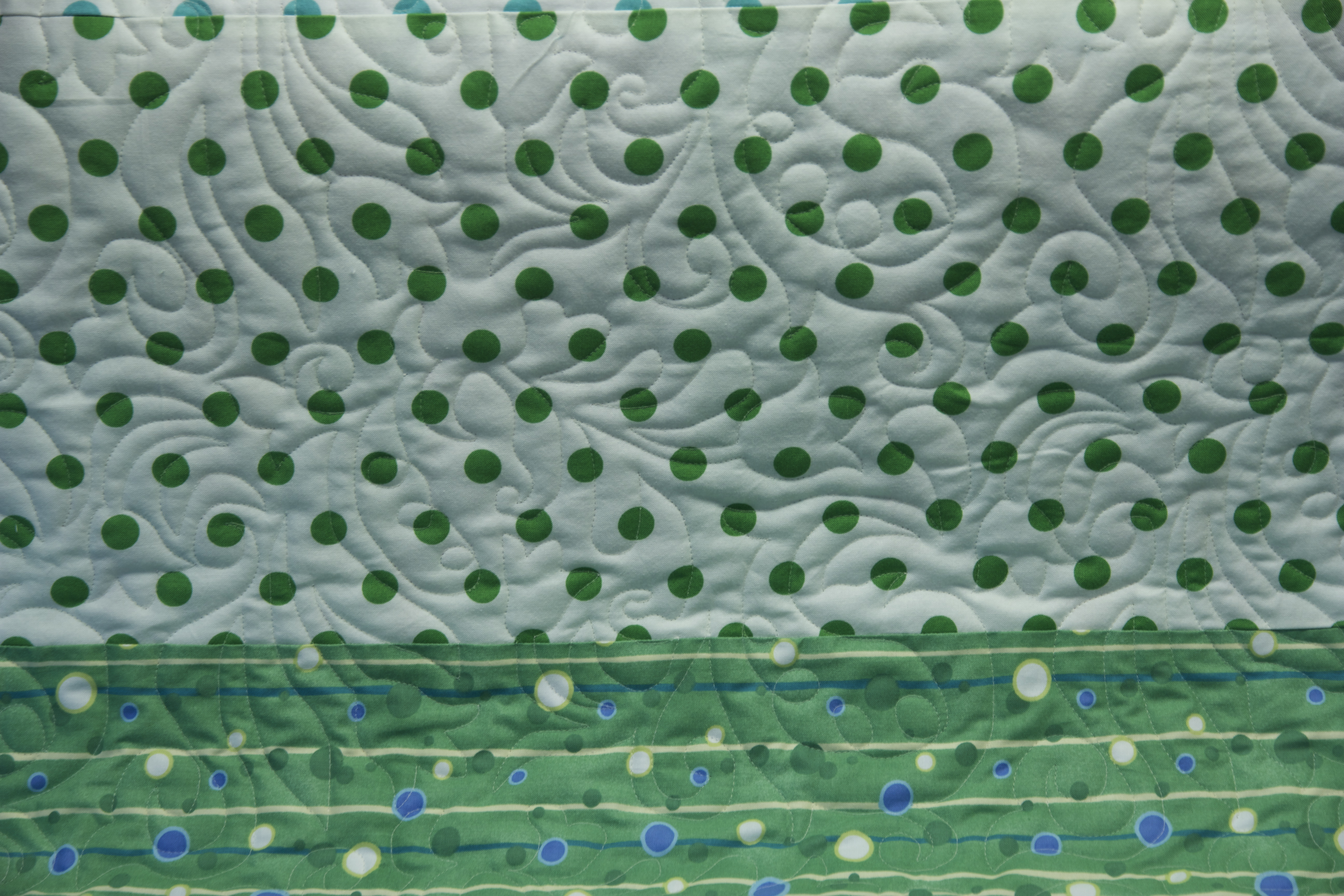 I’ve been working on charity quilts for Quilts Beyond Borders. QBB sends to the quilter the pieced top, backing and binding. The quilter supplies the batting, quilts the layers and finishes off the binding. Besides providing constructive practice time, I found these charity quilts proved that quilting adds a depth and beauty to a quilt that it didn’t previously have. This plain quilt particularly proved it as I felt it had no unifying design, but, unfortunately, I didn’t take a picture before I had quilted it. Sorry, I am. This is the quilt after quilting. I’ll have to take a better full quilt picture later.