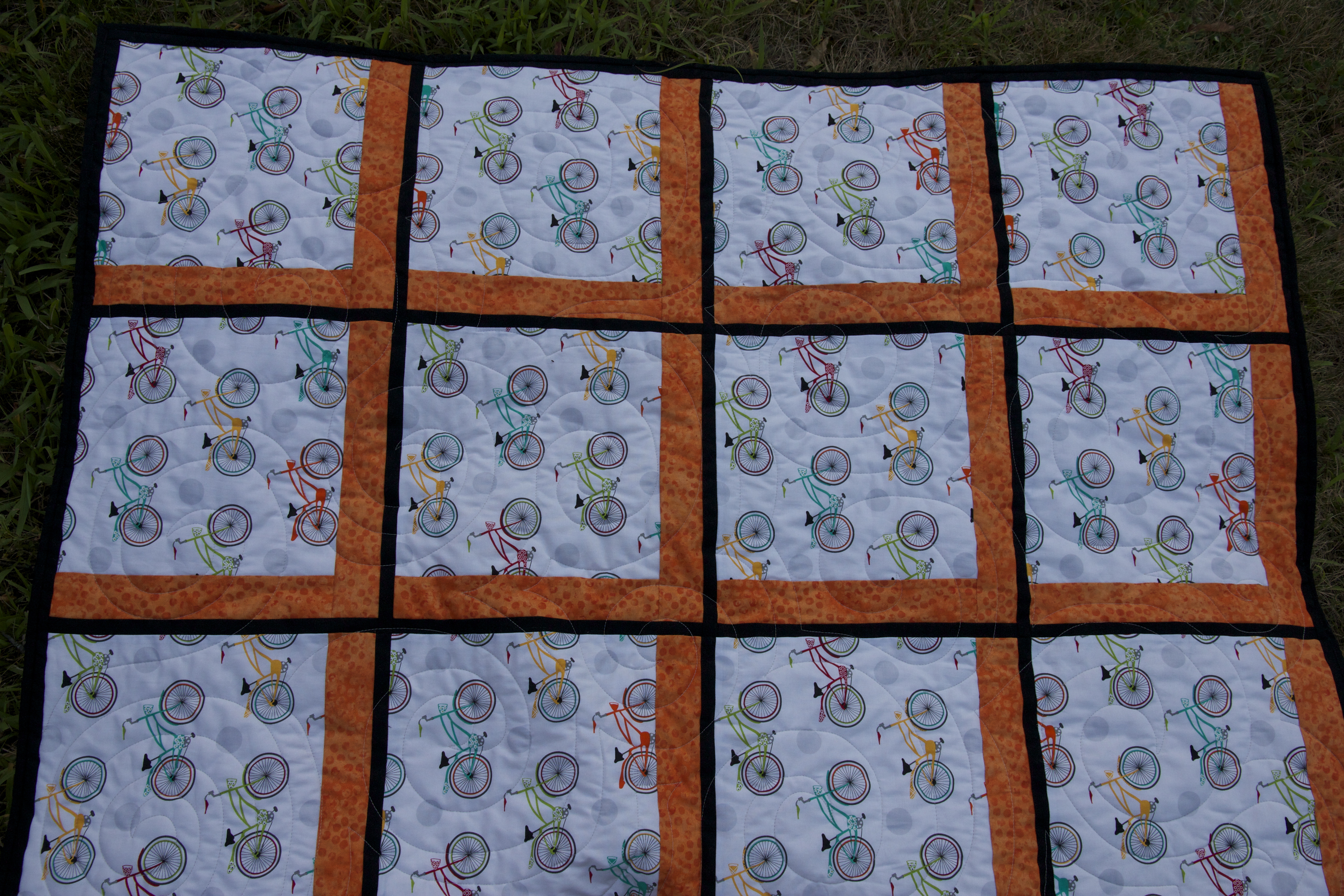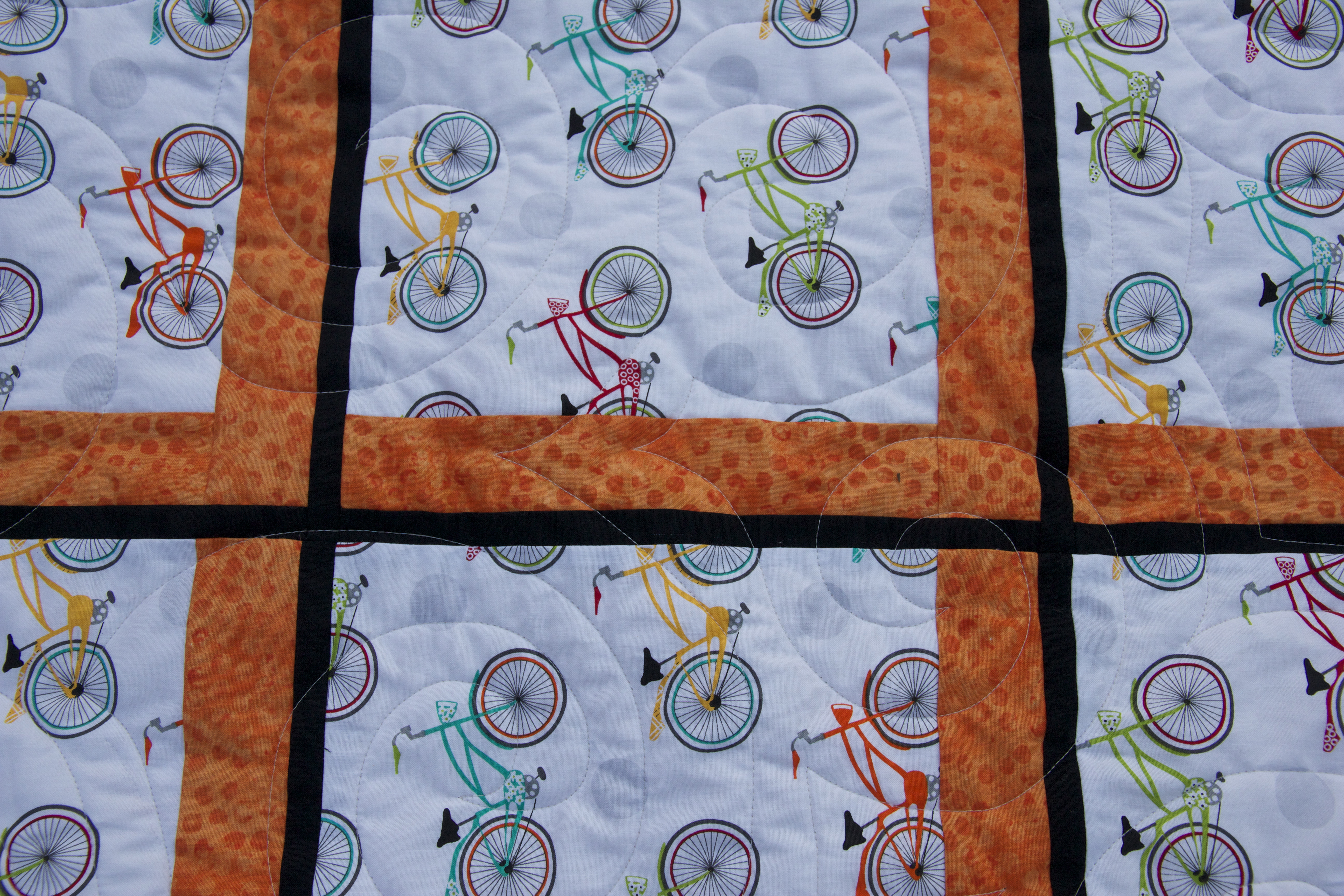 I quilted large free-hand swirls to bring some motion to the bicycles. I made the quilting loose so the it would be soft. In addition, I have washed the quilt so it will be fresh and clean for the newborn. This way the parent will not be afraid to wash it.