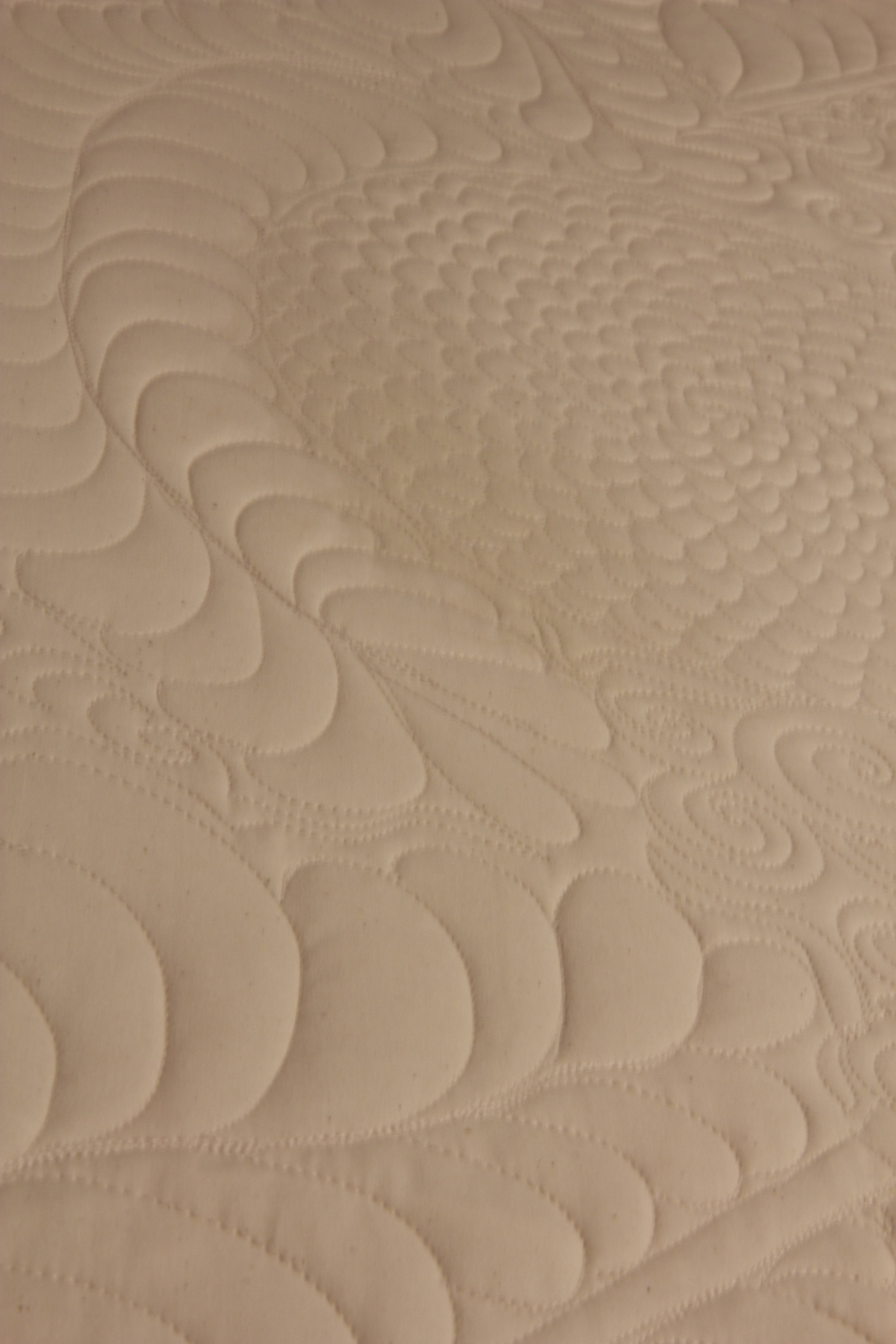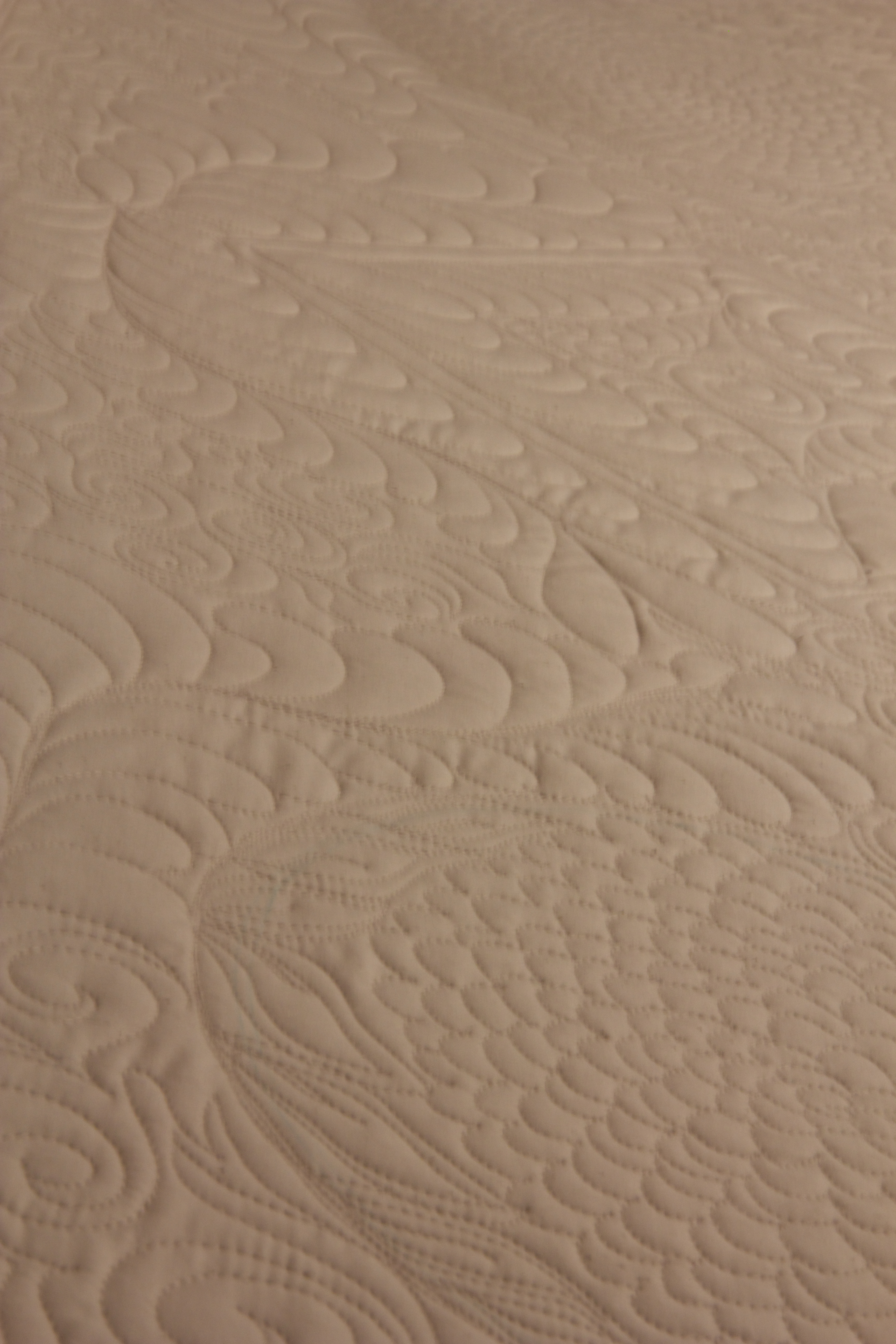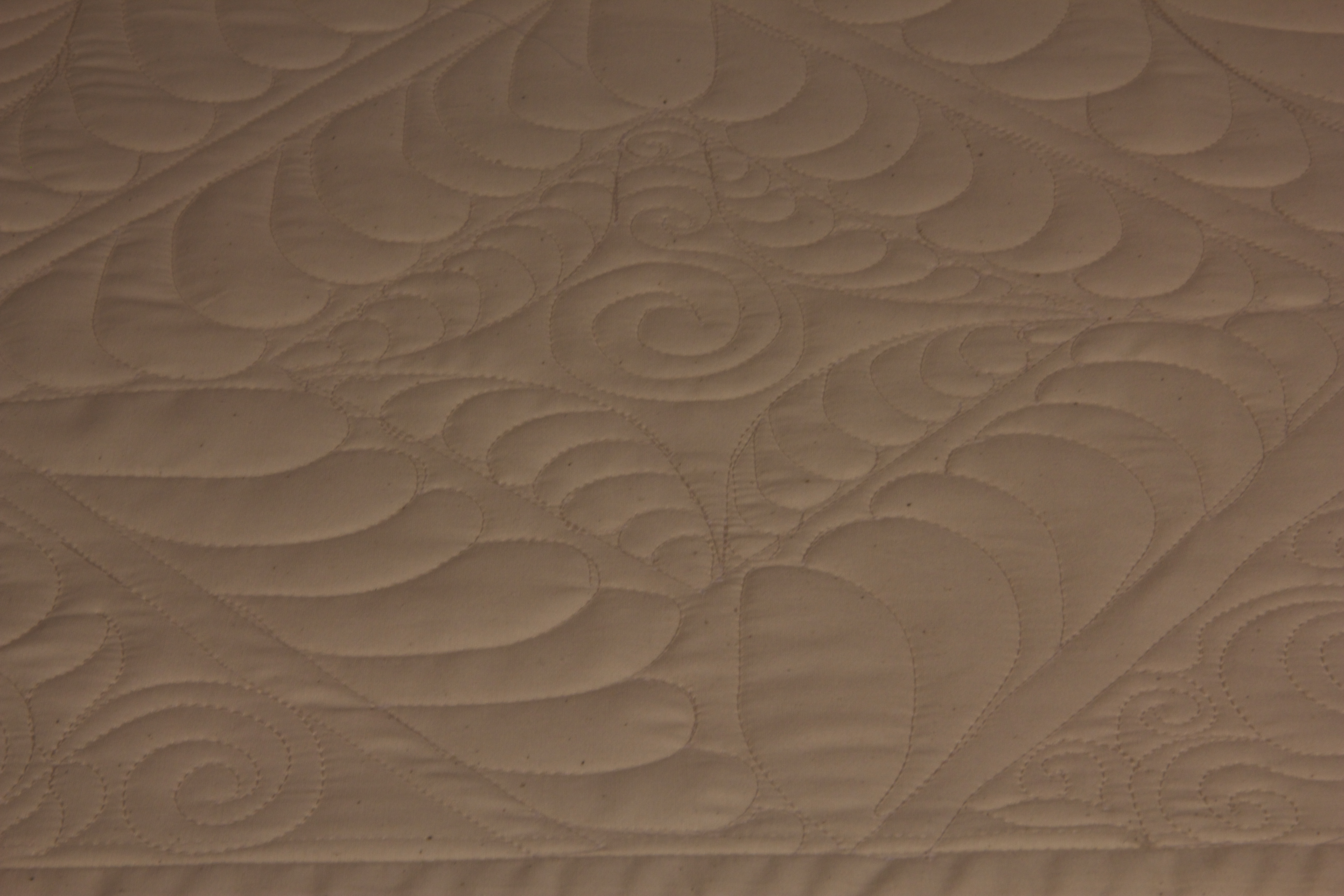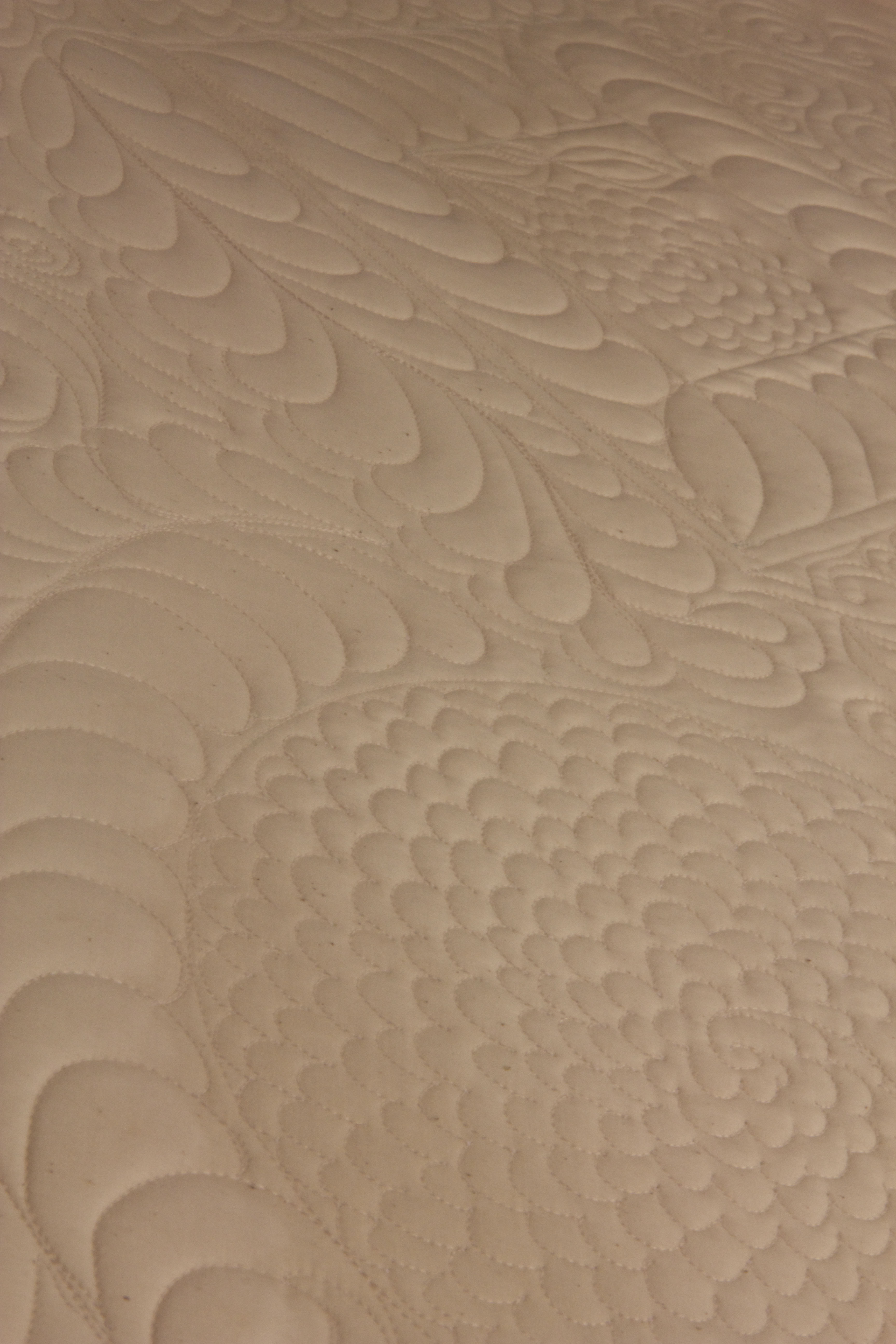 Between finishing one section of house trim painting and a party welcoming home my daughter and her husband, I have been able to squeak out two afternoons of practicing my custom quilting technique. Here’s what it looks like: