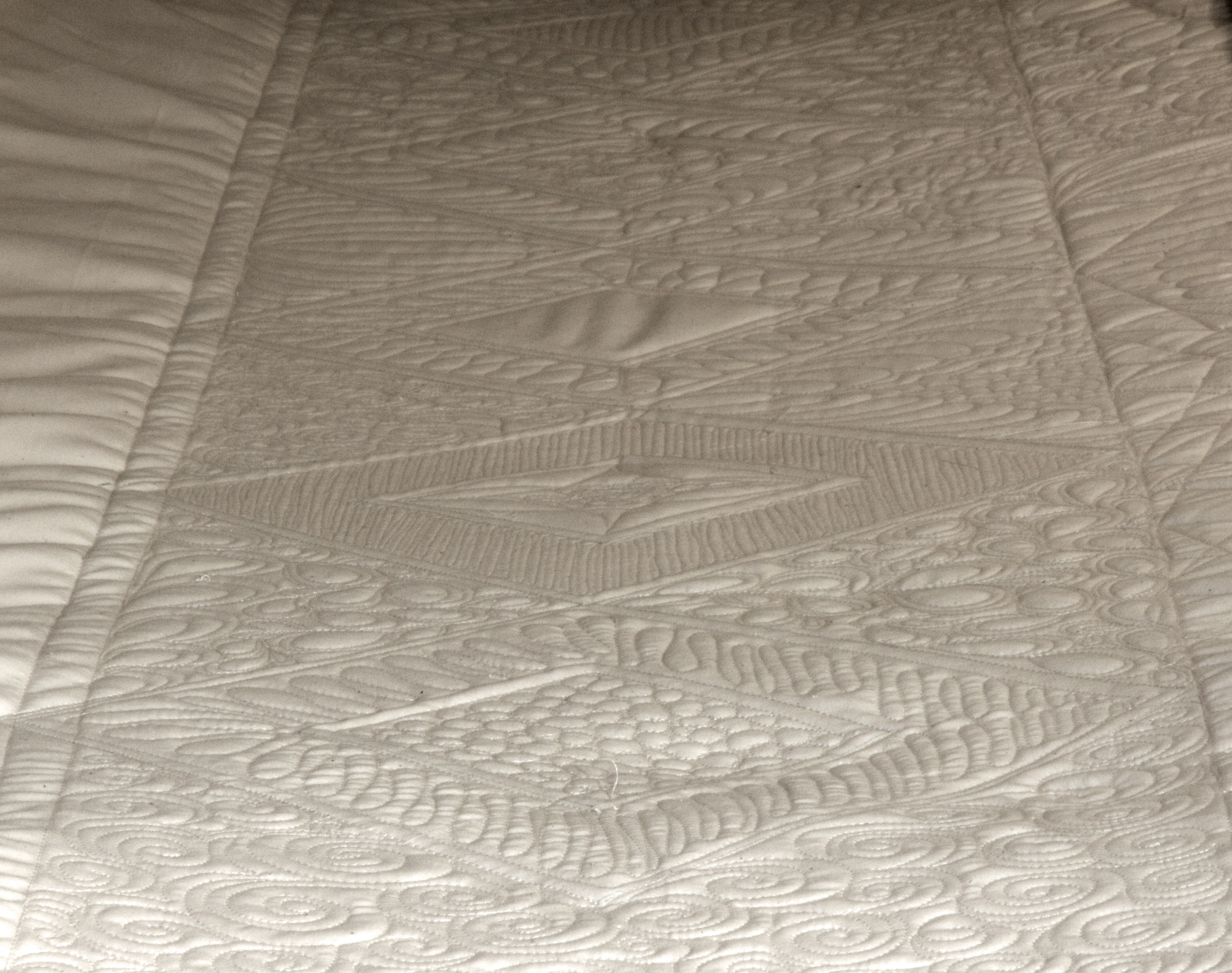 I’m inconsistent with the saturation. I like the first and last photographs the best.  The other two are too yellow.  Also, I suppose if I am going to take pictures I should spray away my markings and clip the threads.  Nonetheless, the stitch definition is much better, which is what I was working on.  I used a remote flash attachment so I could get the light at a thirty degree angle to the fabric, which apparently properly highlights the stitching.  It’s a start.  Feel free to provide suggestions on how to improve my photographs.  One problem I can’t seem to perfect is my impatience with the process.  Happy quilting.