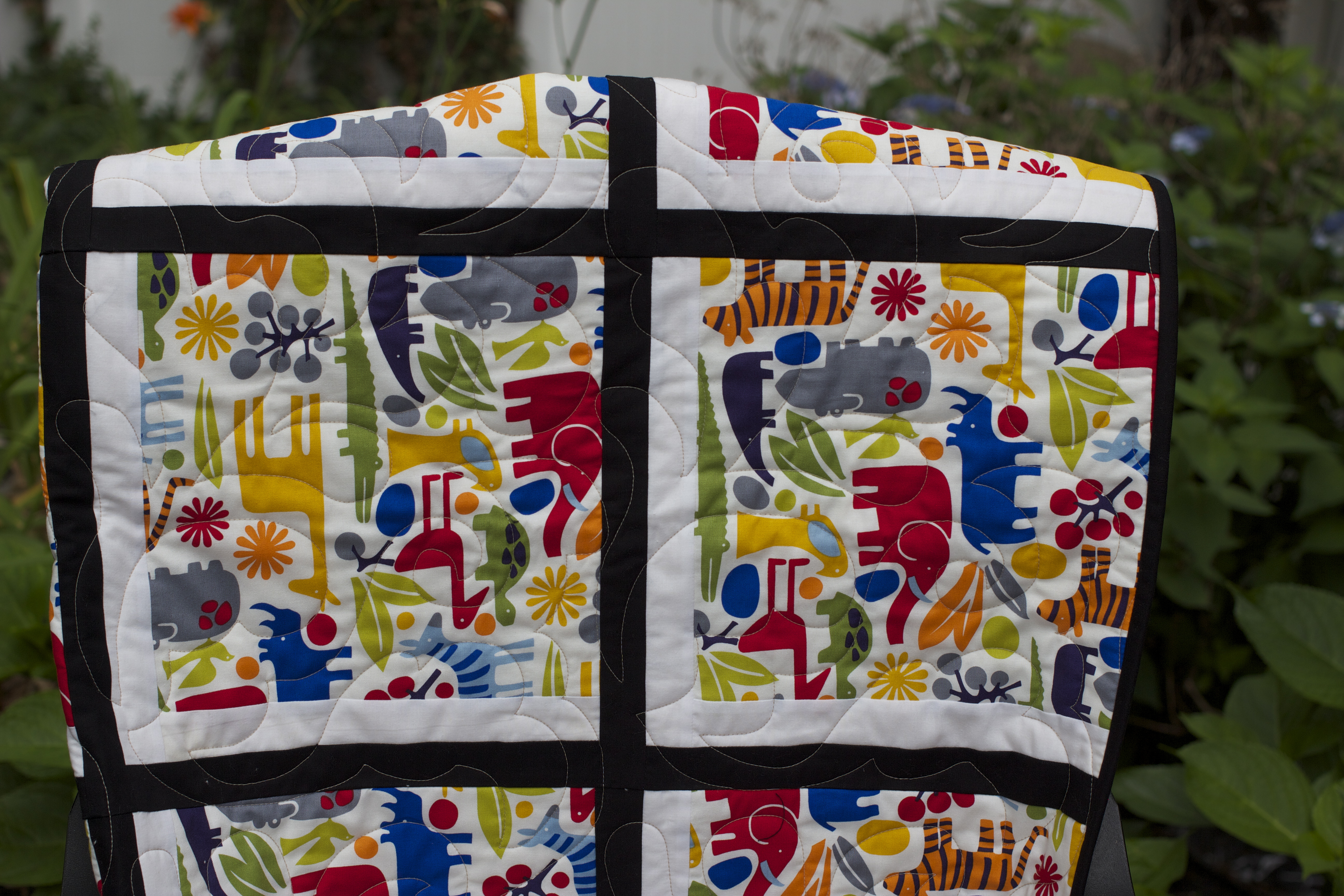 Here’s a different accent fabric. Here again, we have the black and white contrast. We also have some strong contrast between the white and the many colors of the giraffes. There are also some fine details to interest the baby. At around four months, you might find the baby picking at the giraffe, bike or animal figures, because she/he is beginning to develop depth perception and is trying to pick up the figure. So you can see, these quilts grow with the baby. (For further details regarding visual development, see the American Optometric Association.)