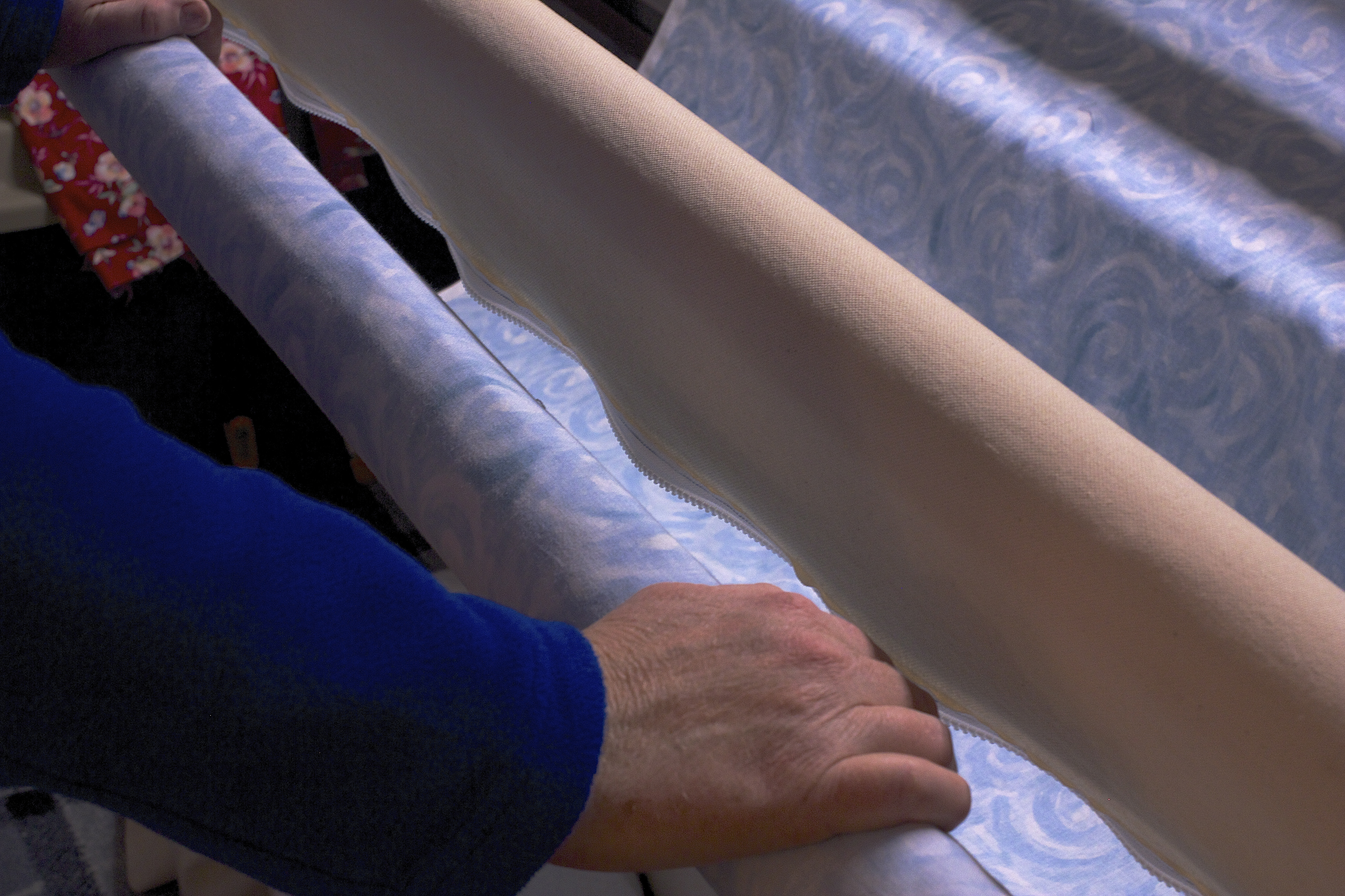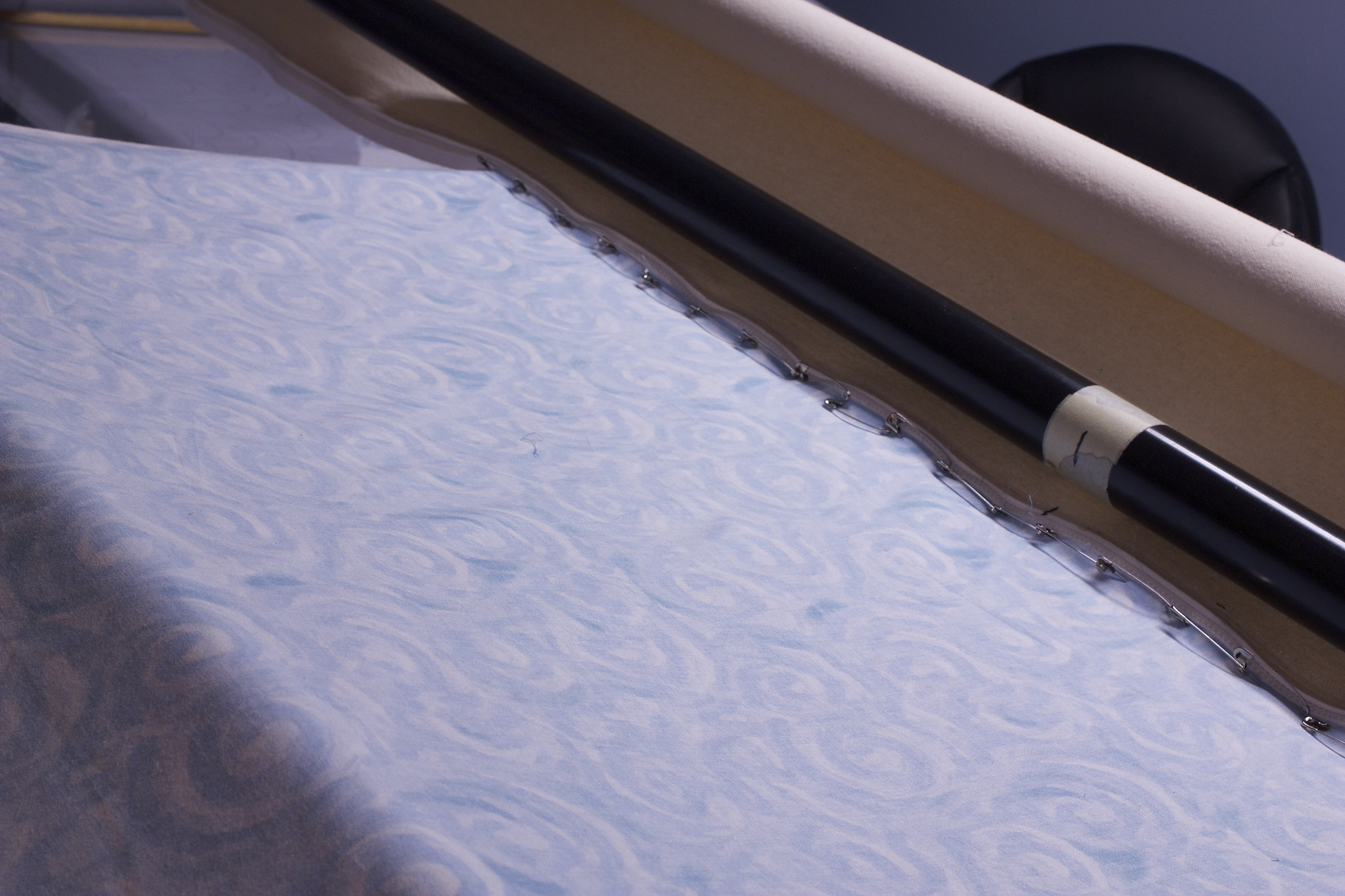 Notice that only the top of the batting is pinned. I will baste the top and edges before starting the design. I also continue to baste the edges as I roll the quilt sandwich.