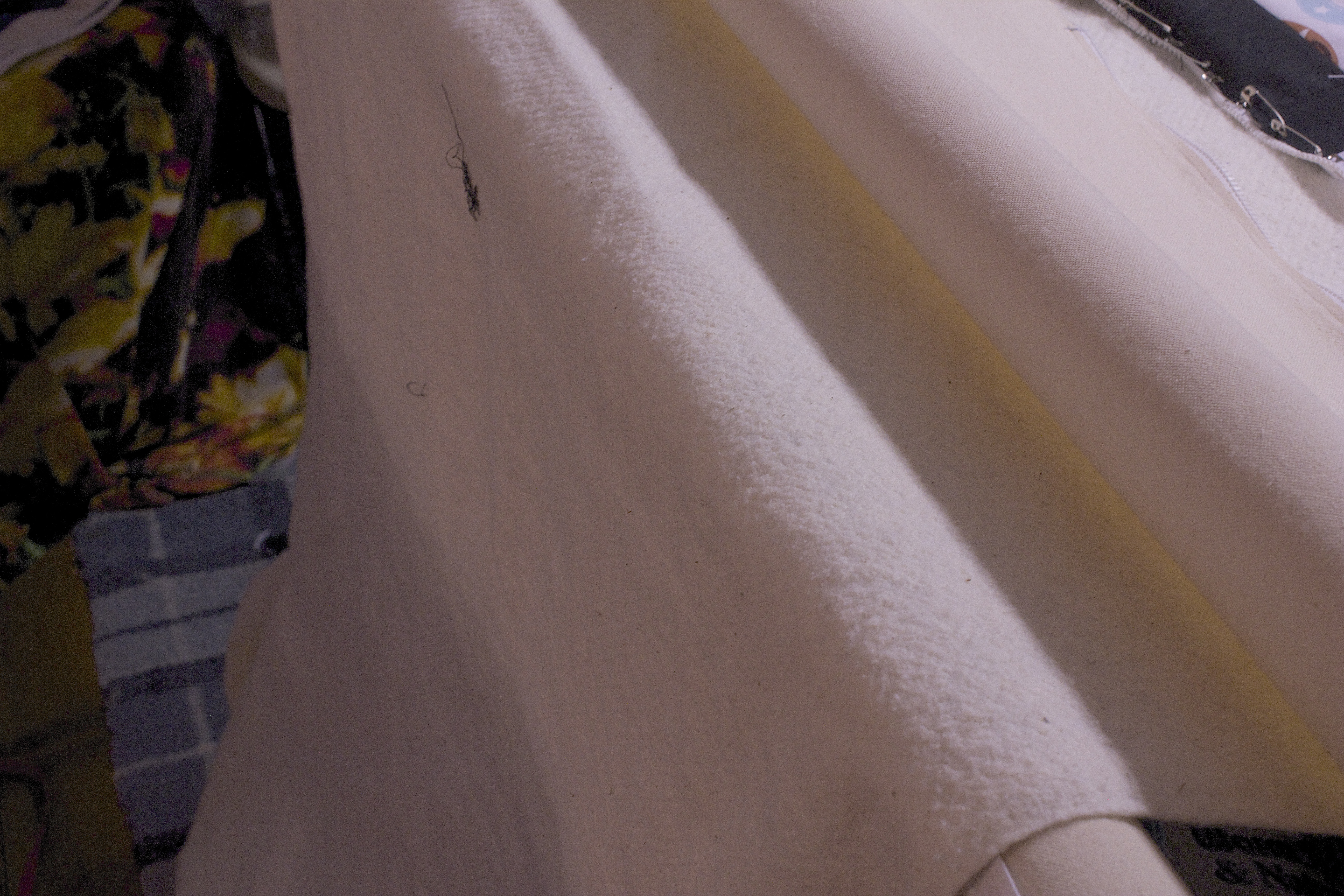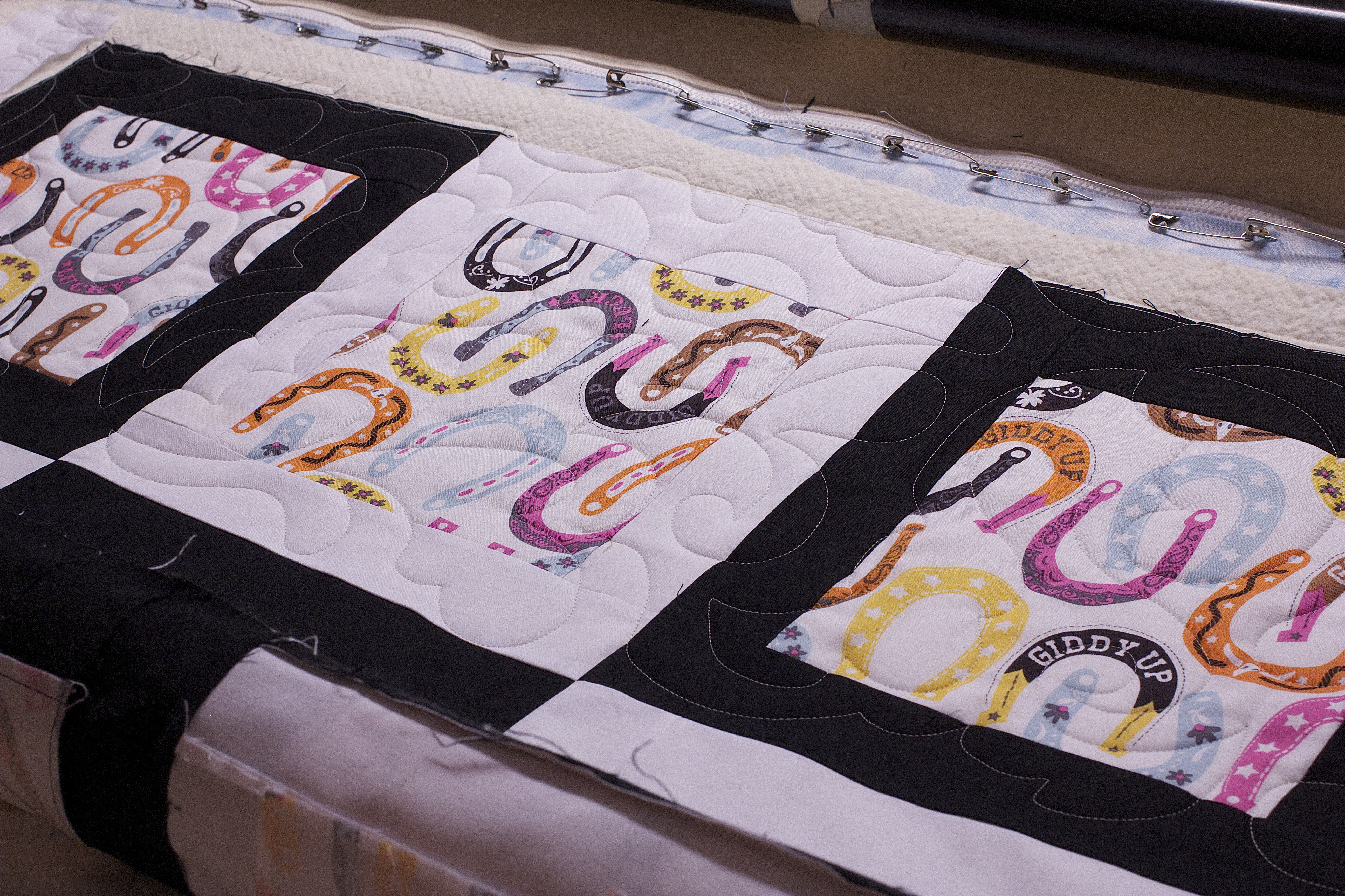Here’s the other quilt I was working on this day. Notice how the bottom of the quilt is no longer pinned to the leader and is floating. I have basted the edges so the quilt remains square. Again, if you click on the photograph you can see the basting, approximately 1″ to 1 1/2 ” long. I float the top only when I’m on my last pass.