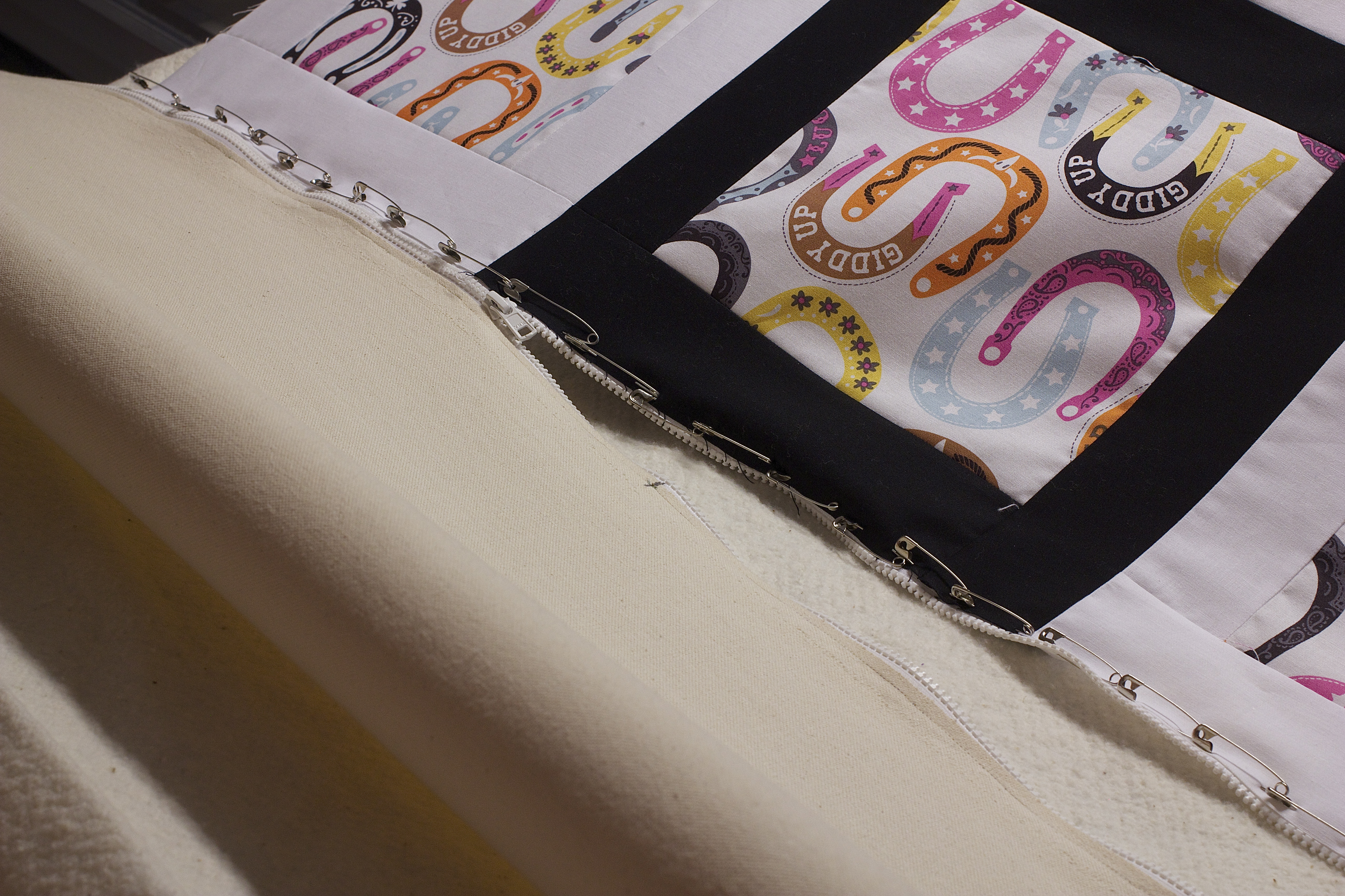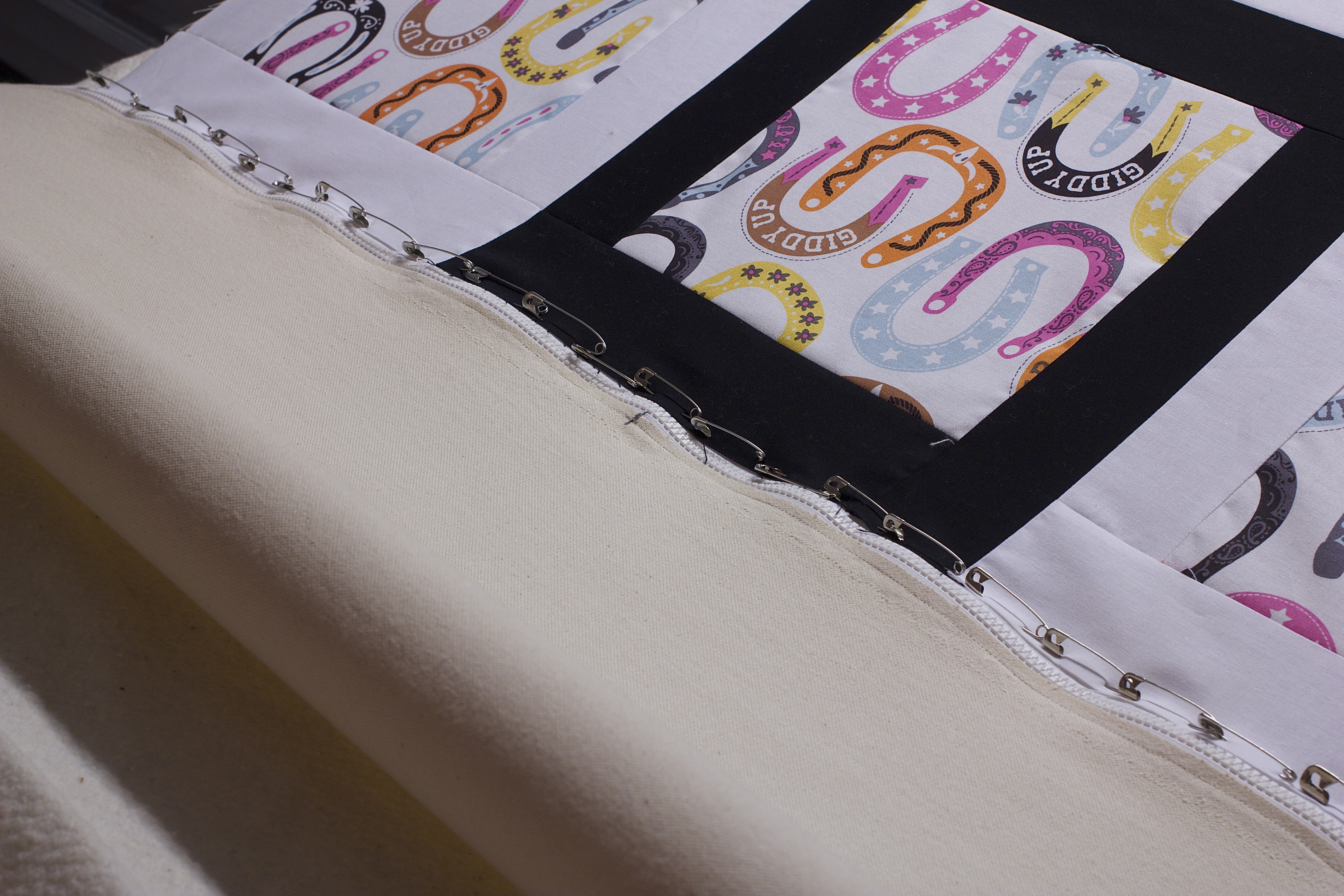 First I pin the back, right side down to the top and bottom leaders. I can then zip it onto my APQS Millenium, fondly called Alice, if you must know.